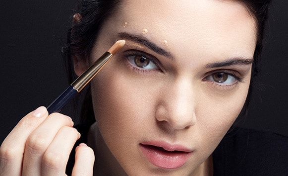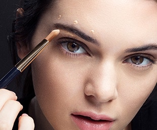 Place 3 highlighter dots above brows — at inner corner, arch peak and tail. Add more under and along browbone. Tap to blend.