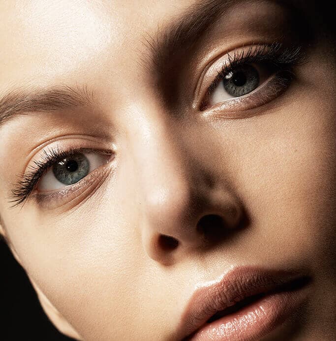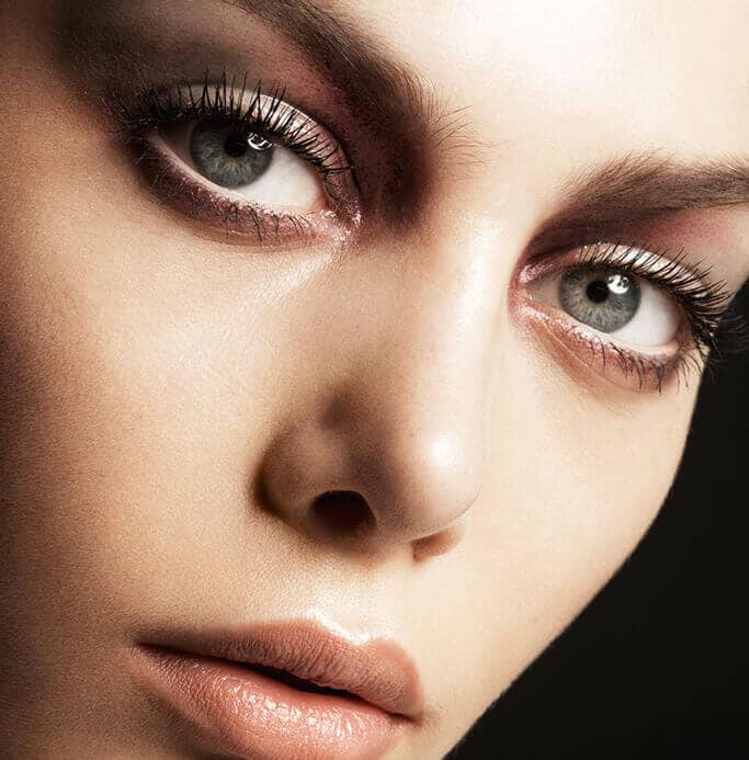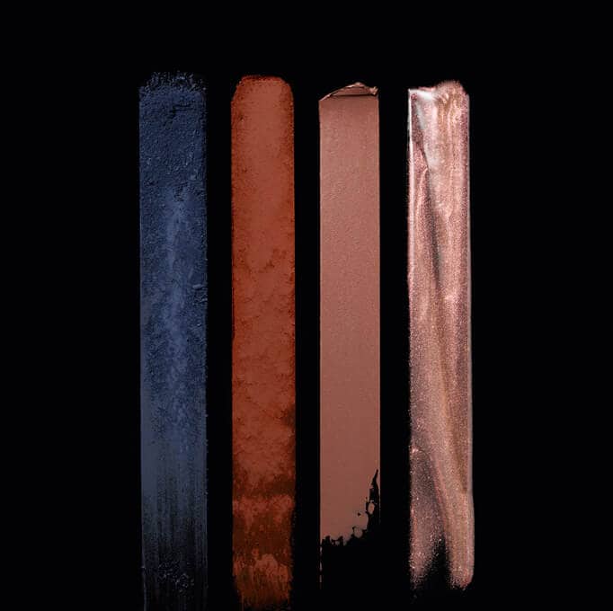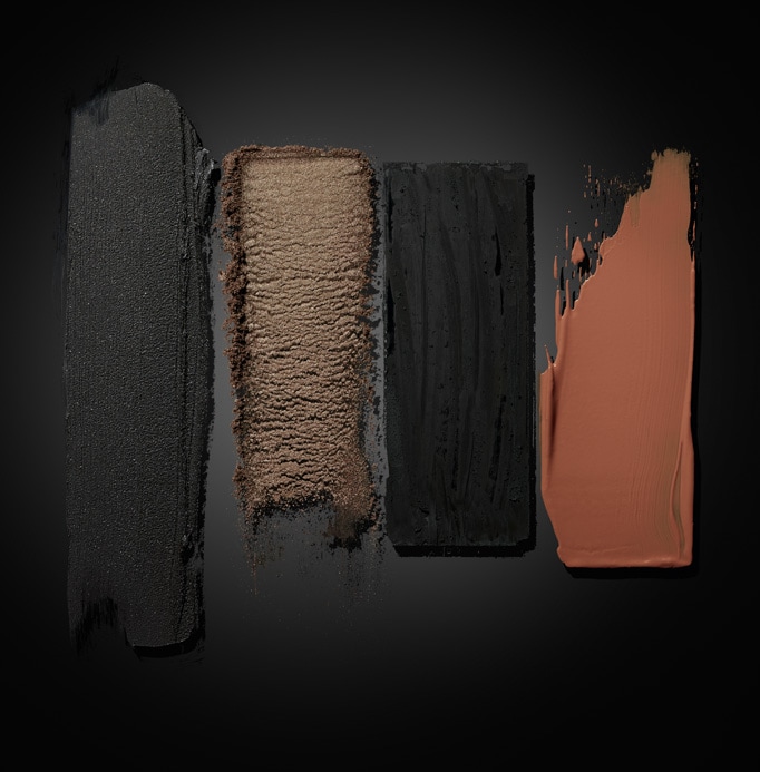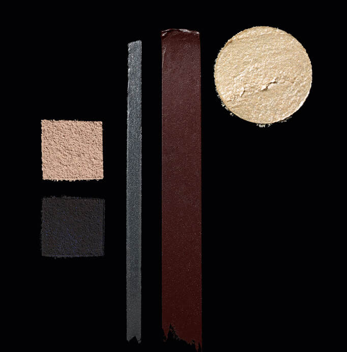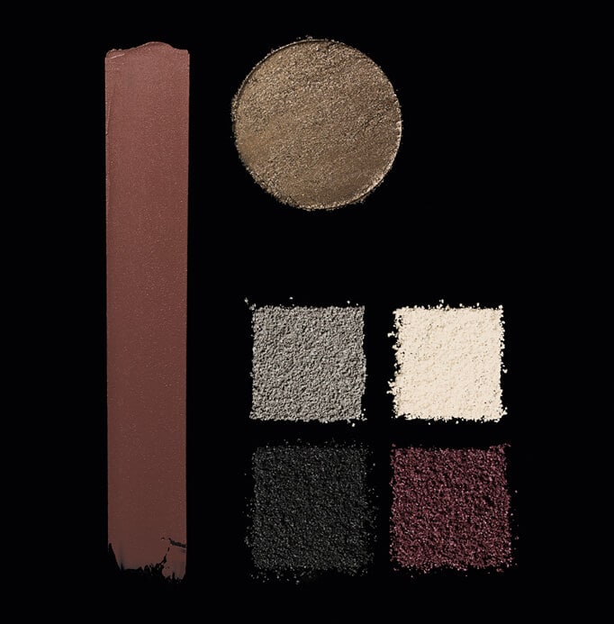 Smoldering eyes in tones of grey smoke and lush bordeaux. Sparked with bronze and edged with a haze of grey liner. The new nude lip is deeper in intensity and more impactful in matte.