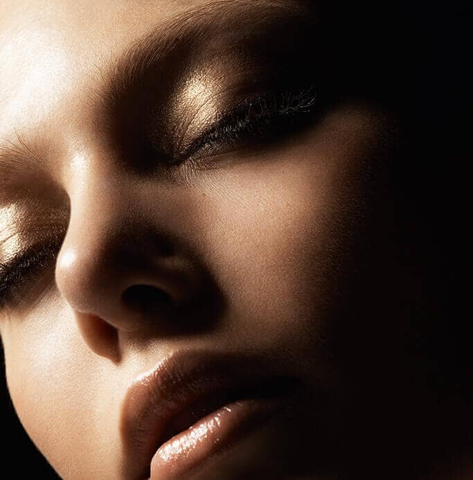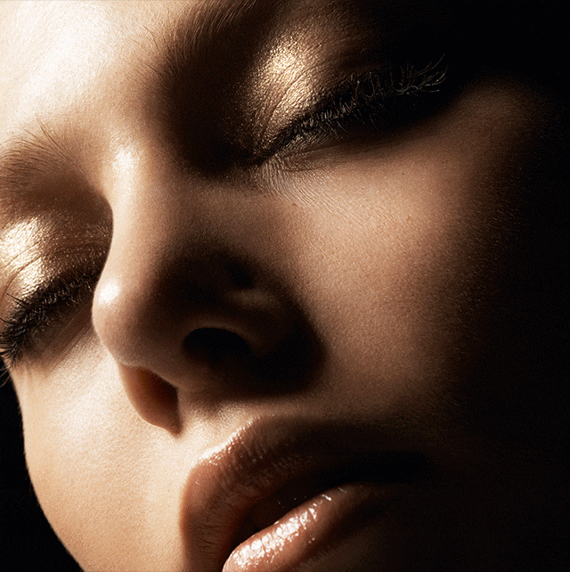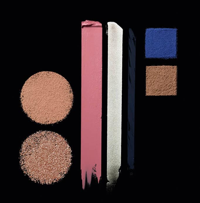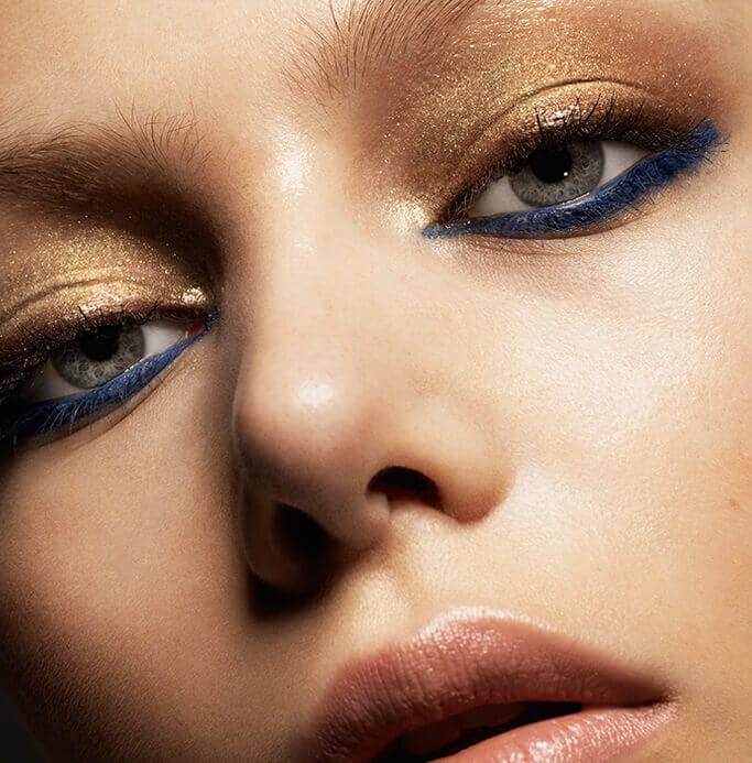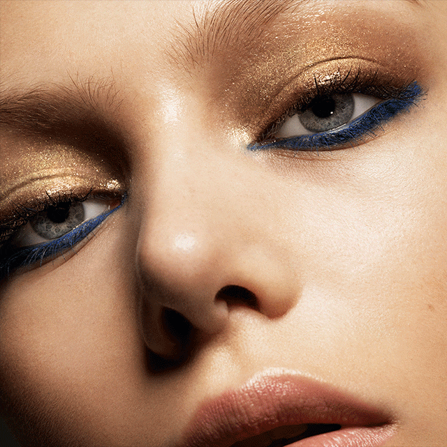 Dewy flushed cheeks and warm bronzed skin, accented with rays of liquid gold light. Art Deco electric blue gives a jolt of cool.