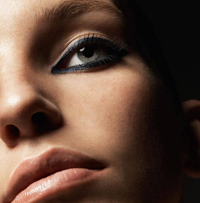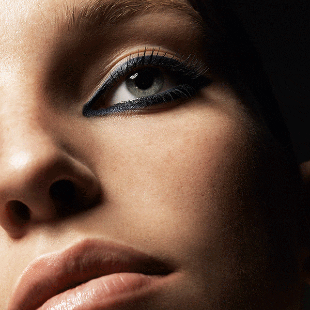 A strong navy eye with non-stop sexy liner. The look is balanced by a softer nude lip that shimmers with gloss.