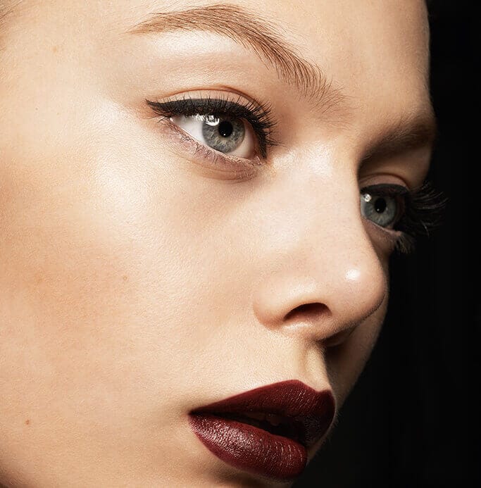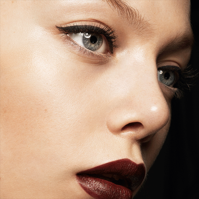 Sensual and bold. The Parisian lip is opulent in matte black cassis. The eye is simple, yet graphic. Super matte black liquid eyeliner provides a cool approach to a classically defined French look.