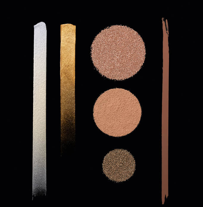 A laid-back look where glowing skin is all you really need. Warm tones of java, clove and molten gold accentuate eyes. Matte bronzer and nude glossy lips evoke sophisticated ease with an L.A. attitude.